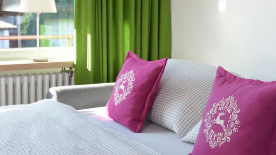 Auf 28 qm in der 1. Etage erwartet Sie ein gemütlicher Wohn-Schlafbereich mit Boxspringbett, eine kleine Kochnische sowie ein Badezimmer. Genießen Sie den Balkon mit herrlichem Orts-und Bergblick. Highlight ist das hauseigene Hallenbad und die Sauna.